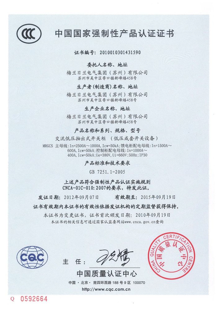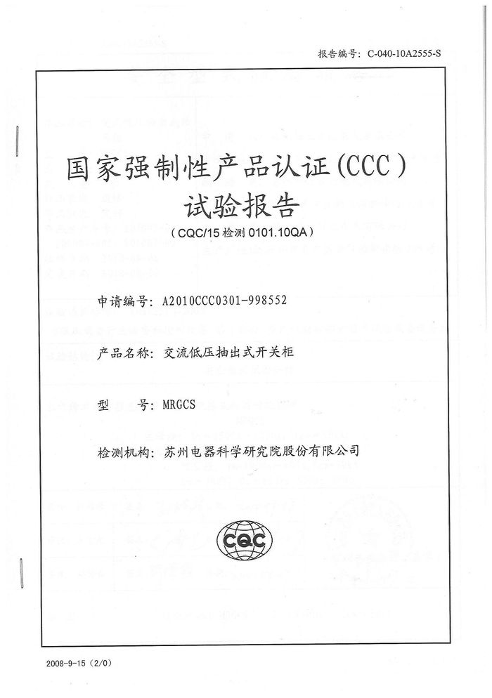 (成套)MRGCS開(kāi)關(guān)柜資質(zhì)證書(shū)