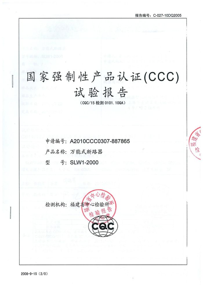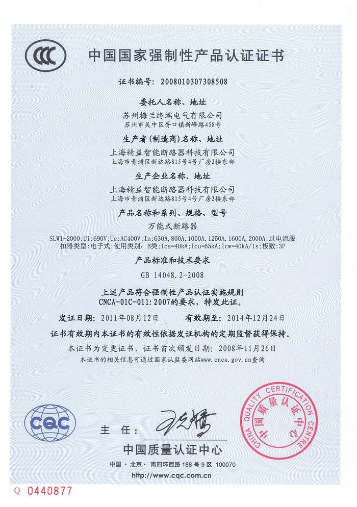 SLW1-2000萬能斷路器資質(zhì)證書