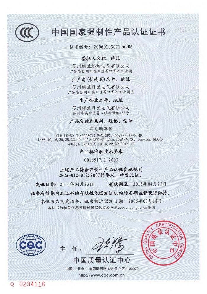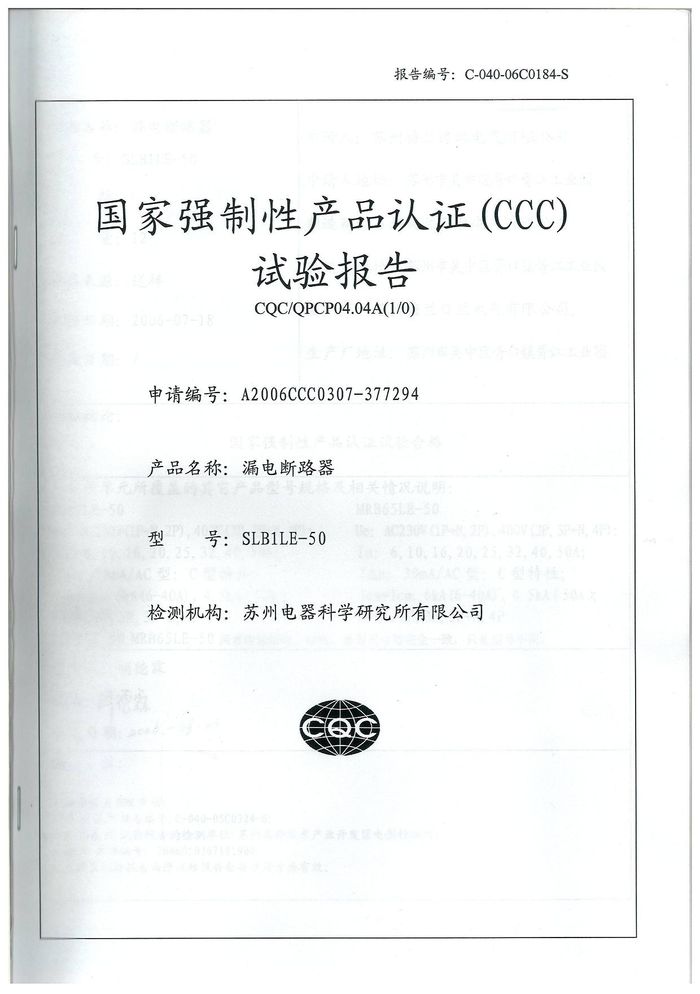 SLBLE-50漏電斷路器資質(zhì)證書(shū)