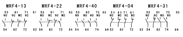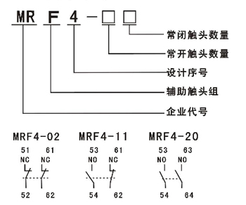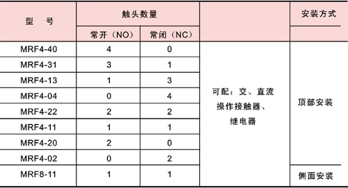 MRF系列有二極和四極兩種,該輔助觸頭組和交流接觸器或接觸器式繼電器組合后能擴(kuò)展輔助觸點的數(shù)量。