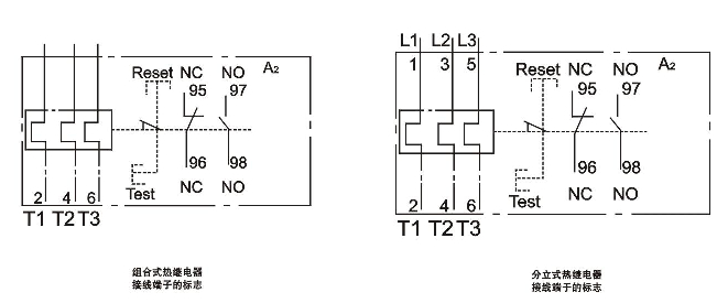 1、具有二種安裝方式,組合式安裝直接插入接觸器,分立式可單獨(dú)安裝或安裝在導(dǎo)軌上。