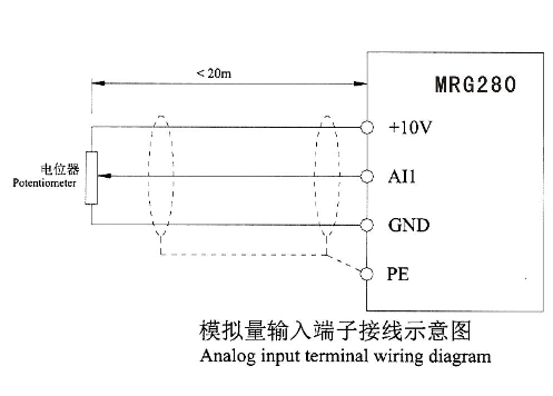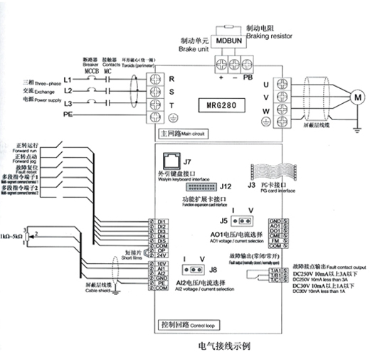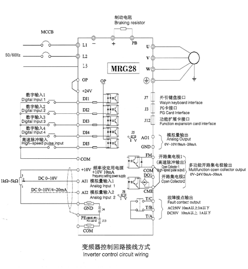 注:所有MRG280系列變頻器控制回路接線(xiàn)方式一樣,上圖為三相380V變頻器接線(xiàn)示意圖,端子◎表示主回路端子,0表示控制回路端子。
