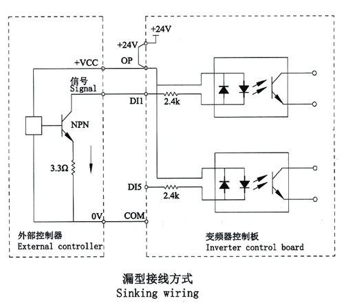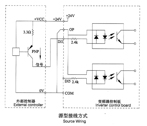 這是一種最常用的接線(xiàn)方式。如果使用外部電源,必須把+24V與OP間的短接片去掉,把外部電源的24V正極接在OP端子,外部電源OV經(jīng)控制器控制觸點(diǎn)后接到相應(yīng)的Dl端子。