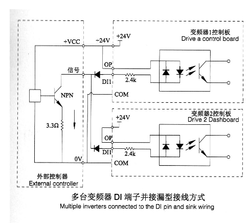 注意:此種接線(xiàn)方式,下同變頻器的Dl端子不能并接使用,否則可能引起Dl的誤動(dòng)作;若需Dl端子并接(不同變頻器之間),則需在Dl端子處串接二吸管(陽(yáng)極接Dl)使用,二極管需滿(mǎn)足;IF>lOmA、UF<1V,如下圖。