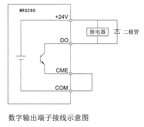 注2:數(shù)字輸出地CME與數(shù)字輸入地COM是內(nèi)部隔離的,但出廠(chǎng)時(shí)CME與COM已經(jīng)外部短接(此時(shí)D01默認(rèn)為+24V驅(qū)動(dòng))。當(dāng)D01想用外部電源驅(qū)動(dòng)時(shí),必須斷開(kāi)CME與COM的外部短接。