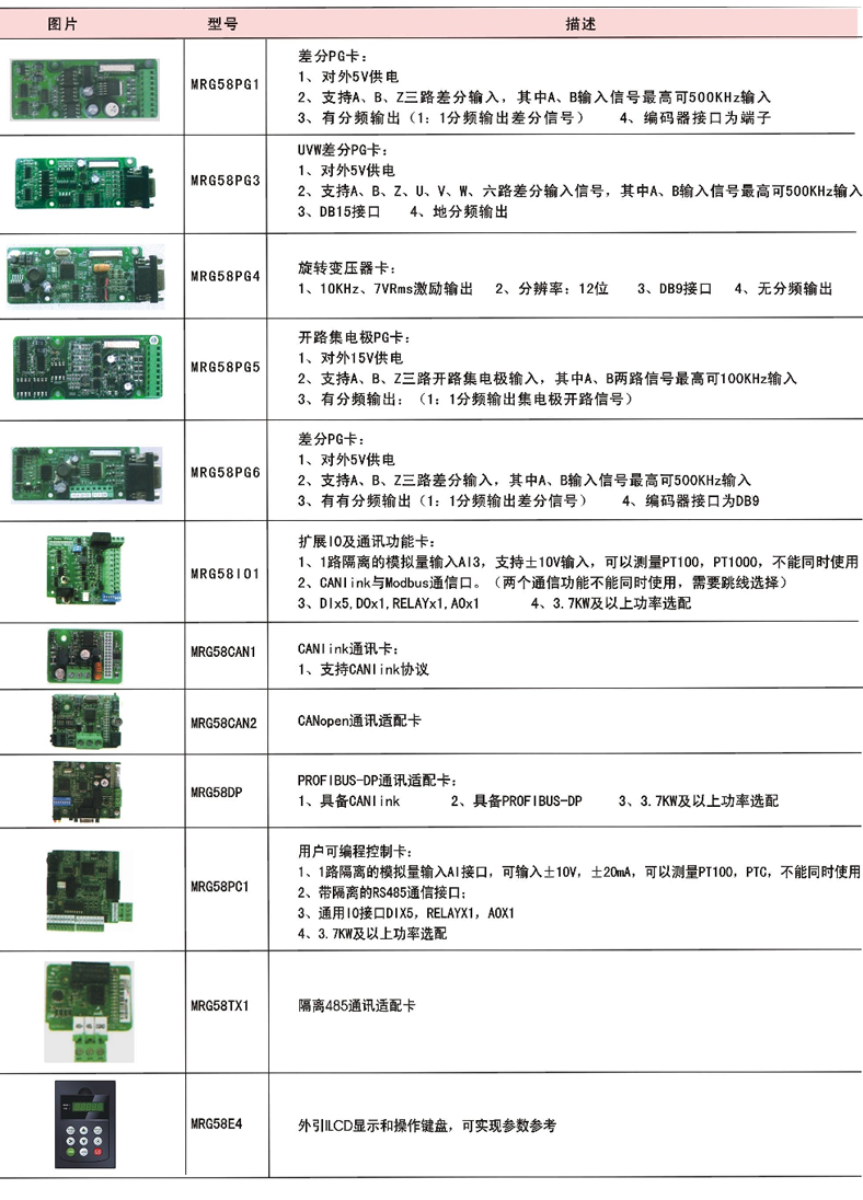 選配件 多功能輸入輸出擴(kuò)展卡、制動(dòng)組件、通訊卡、PG卡、用戶可編程卡等